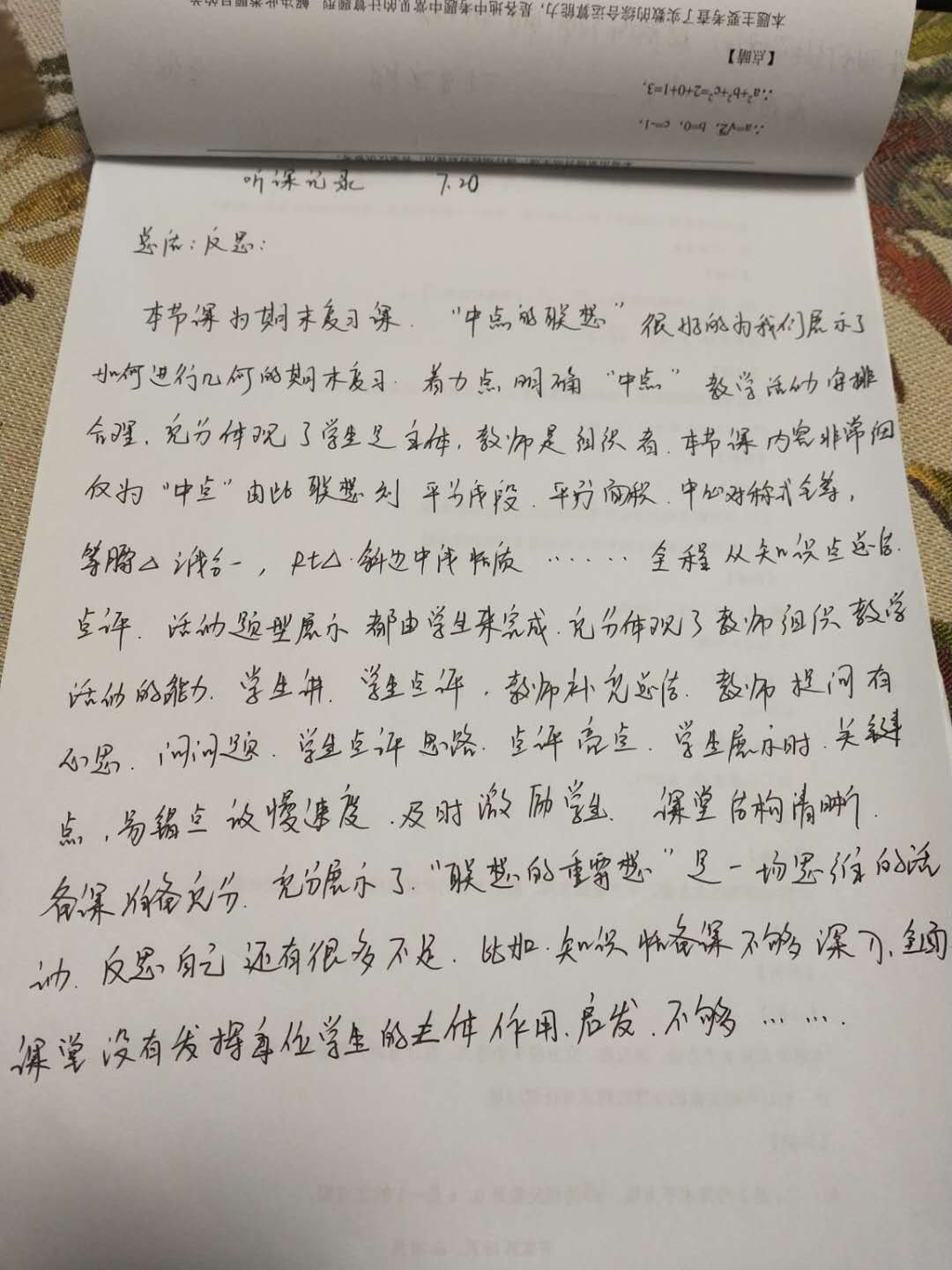 总结与反思:本节为期末复习课,中点的联想很好的为我们展示了如何进行几何期末复习。着力于中点展开的教学活动。充分体现了学生是主体,教师是组织者。本节内容非常细致,由中点展开联想到线段平分点,平分面积,中心对称式全等,等腰三角形三线合一,直角三角形斜边中线的性质等等。全程从知识点总结,点评,做题展示补充点评都由学生来完成后教师再来补充。提问有心思。问题有重点。遇到易错题。易错点时放慢速度,并及发问、鼓励学生勇于挑战。课堂结构清晰。备课充分。体现了联想的重要性,是一场思维的活动。反思自己的不足:知识性备课不够深入,没有发挥每位学生的主体作用,课堂对学生的启发不够......这些都是今后教学中需要注意的。 |
