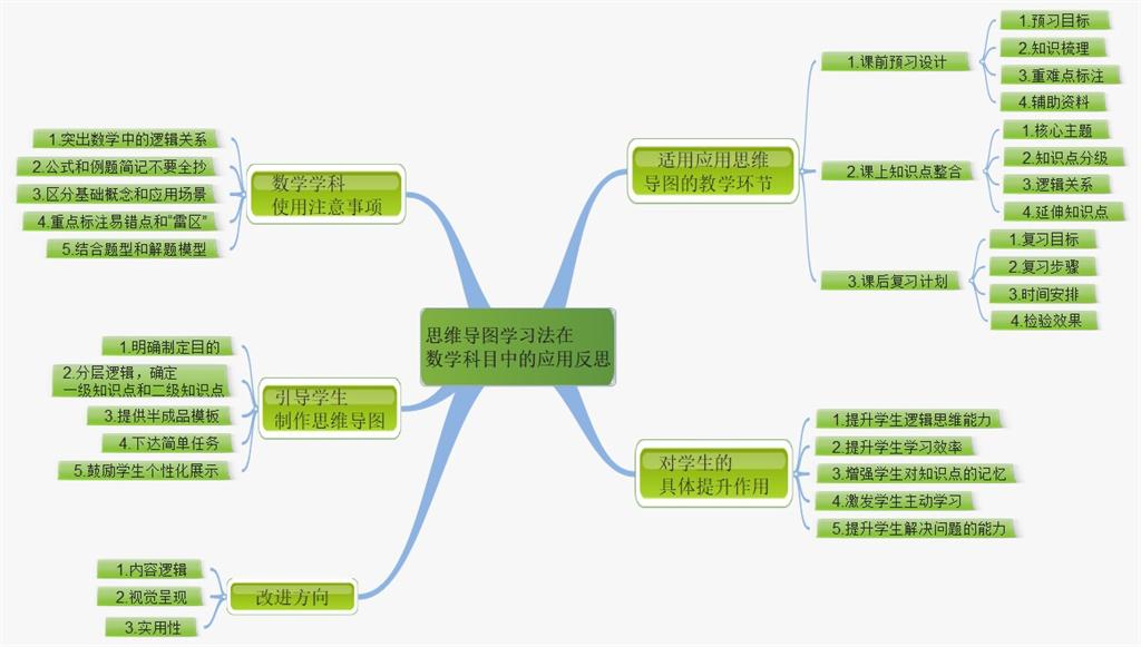 这是有关于思维导图在数学科目中的反思应用,主要分为五个方向,适用应用思维导图的教学环节,对学生的具体提升作用,数学学科使用的注意事项,引导学生制作思维导图和改进方向。每个方向又详细说明了它的具体做法。