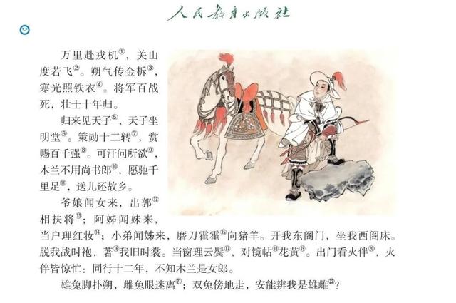 唧唧复唧唧,木兰当户织。不闻机杼声,唯闻女叹息。问女何所思,问女何所忆。女亦无所思,女亦无所忆。昨夜见军帖,可汗大点兵,军书十二卷,卷卷有爷名。阿爷无大儿,木兰无长兄,愿为市鞍马,从此替爷征。东市买骏马,西市买鞍鞯,南市买辔头,北市买长鞭。旦辞爷娘去,暮宿黄河边,不闻爷娘唤女声,但闻黄河流水鸣溅溅。旦辞黄河去,暮至黑山头,不闻爷娘唤女声,但闻燕山胡骑鸣啾啾。万里赴戎机,关山度若飞。朔气传金柝,寒光照铁衣。将军百战死,壮士十年归。归来见天子,天子坐明堂。策勋十二转,赏赐百千强。可汗问所欲,木兰不用尚书郎,愿驰千里足,送儿还故乡。爷娘闻女来,出郭相扶将;阿姊闻妹来,当户理红妆;小弟闻姊来,磨刀霍霍向猪羊。开我东阁门,坐我西阁床,脱我战时袍,著我旧时裳。当窗理云鬓,对镜帖花黄。出门看火伴,火伴皆惊忙:同行十二年,不知木兰是女郎。雄兔脚扑朔,雌兔眼迷离;双兔傍地走,安能辨我是雄雌?