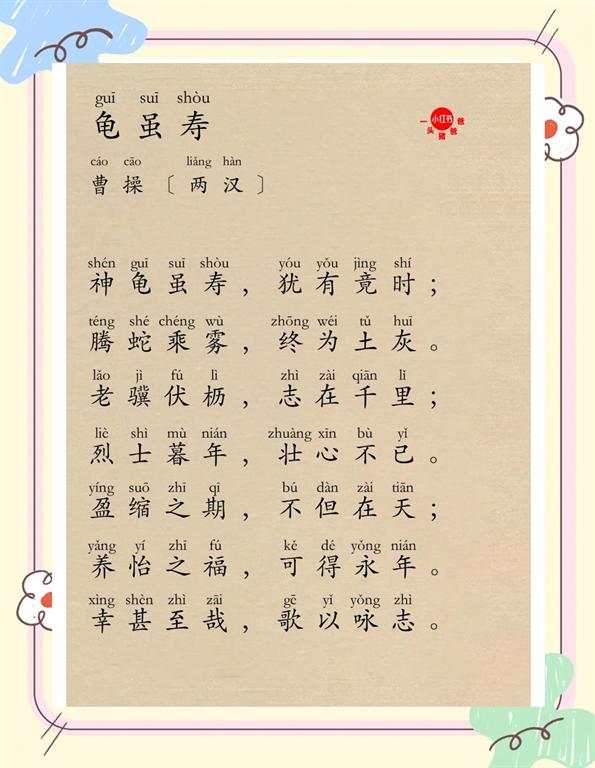 神龟虽寿,犹有竟时。腾蛇乘雾,终为土灰。老骥伏枥,志在千里。烈士暮年,壮心不已。盈缩之期,不但在天。养怡之福,可得永年。幸甚至哉,歌以咏志。