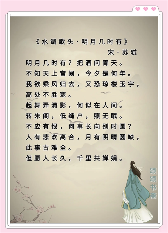 水调歌头⑴丙辰中秋⑵,欢饮达旦⑶,大醉,作此篇,兼怀子由⑷。明月几时有?把酒问青天⑸。不知天上宫阙⑹,今夕是何年。我欲乘风归去⑺,又恐琼楼玉宇⑻,高处不胜寒⑼。起舞弄清影⑽,何似在人间⑾。01:4600:00/01:46水调歌头·明月几时有 音乐改编(北方工业大学-张悦荣)转朱阁,低绮户,照无眠⑿。不应有恨,何事长向别时圆⒀?人有悲欢离合,月有阴晴圆缺,此事古难全⒁。但愿人长久⒂,千里共婵娟⒃。 [1]