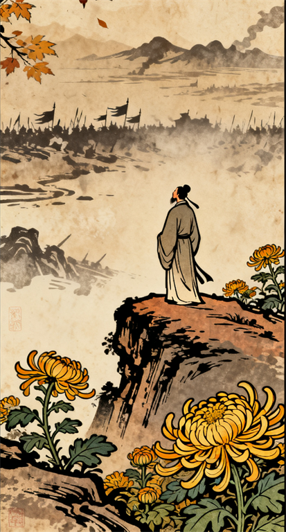 心中遥遥牵挂着故乡的菊花,想必此刻它们也正寂寞地开在战场边缘。