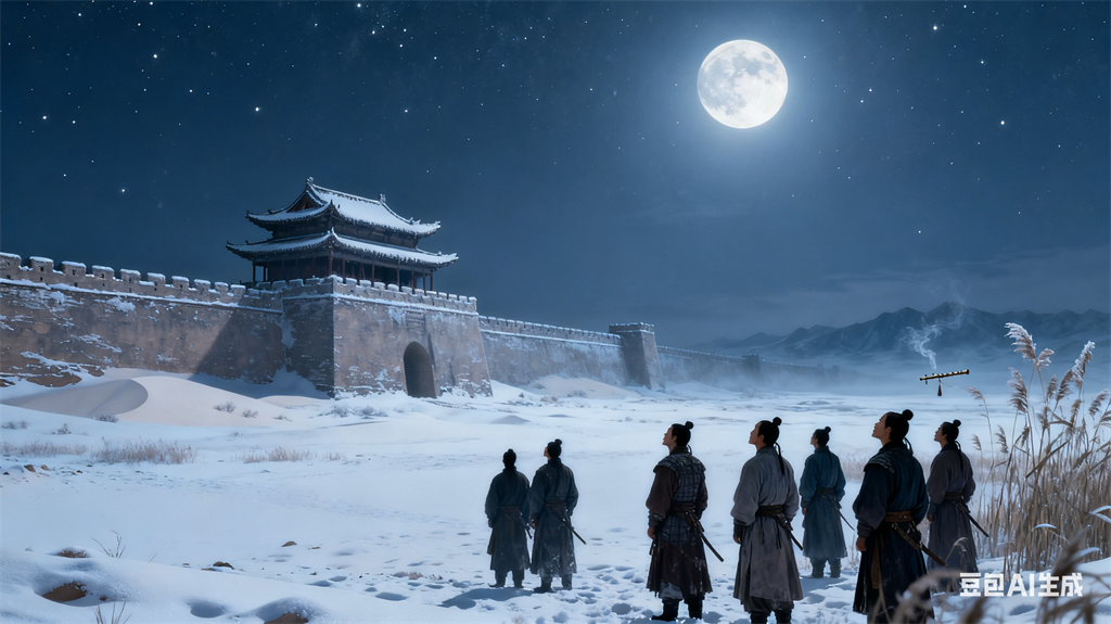 前两句写夜晚登城望远。但见大漠似雪,月华如霜。边城夜色。凄神寒骨。这样的宁静如果不被打破,也许诗中可以沉浸其中。体味大漠那亘古的苍茫。可是。就在这万籁俱寂的夜里。夜风送来凄凉幽怨的芦管声。陡然唤醒了。征人的思乡情绪。顿时。一切崇高和悲伤都化作了绵绵不绝的乡愁。笛声在扩散。愁绪在蔓延。在这样一个凄清的夜晚,集体的失眠也不可避免。读时发挥想象。沉浸其中。试着体会那种苍凉旷远的意境。