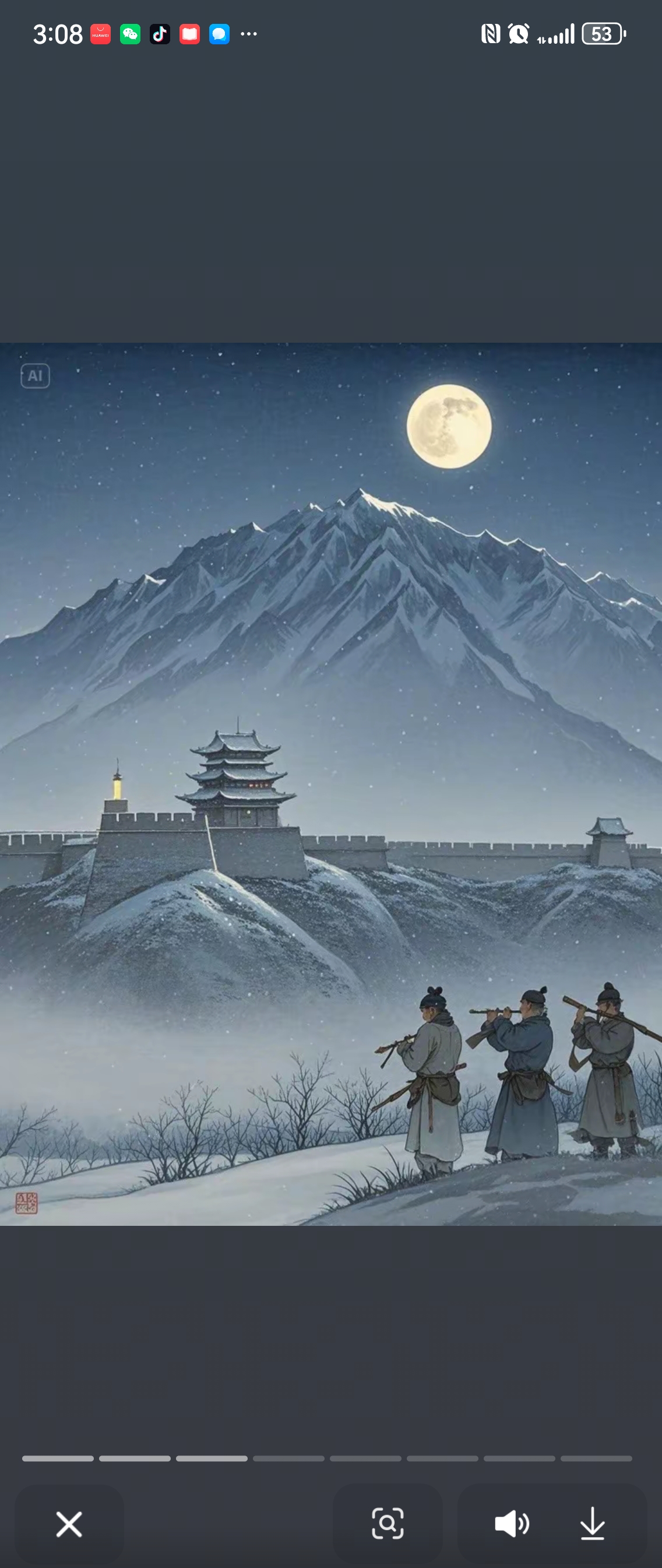 翻译:回乐烽前的沙地白的像雪受降城外的月色冷得如霜,不知从哪里传来芦管的吹奏声整夜驻守边疆的将士们望着故乡的方向