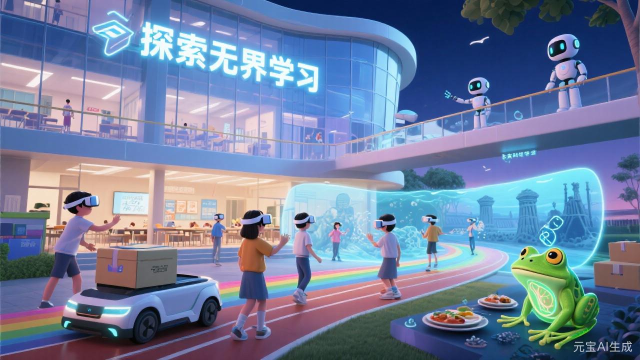 在“探索无界学习”的旗帜下,一场颠覆传统的教育革命正在发生!孩子们戴上VR设备,瞬间从彩虹跑道跃入浩瀚知识宇宙,与发光生物互动,在游戏中点燃求知火花。自动驾驶小车穿梭其间,智慧物流将学习资源精准送达。大楼内外,人类与机器人和谐共事,共筑充满奇思妙想的未来社区。