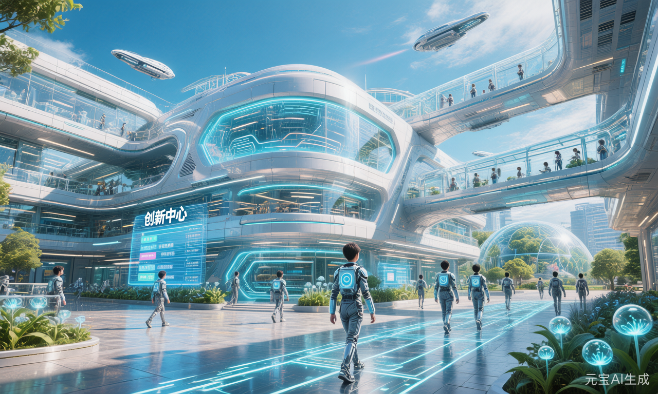 玻璃幕墙教学楼闪耀科技蓝光,全息投影在空中流转着课程信息。学生们佩戴轻量化VR眼镜,指尖轻触悬浮的立体星系与分子模型,眼神里跃动着探索的光芒。友善的机器人老师“阿尔法”弯腰指导,机械臂投影出动态知识图谱,将抽象概念化为可互动的奇妙体验。透明廊桥连接着智慧教室,生态穹顶内绿植葱茏,科技与自然和谐共生。这里,知识突破物理边界,学习是沉浸式的冒险。XX科技中学,用VR打开宇宙,让机器人点燃好奇,每一帧未来,都在此刻发生!