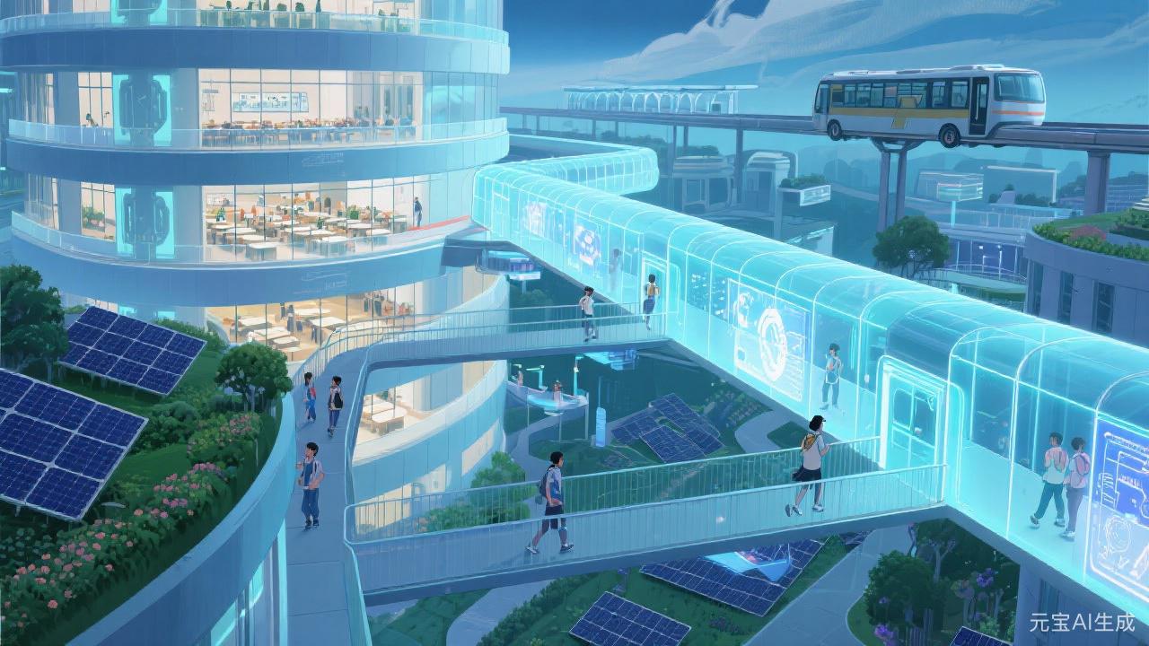 当暮色晕染天际,这座未来城邦正苏醒:环形建筑里,暖光裹着协作的声响;透明连廊中,全息屏流转着智慧的脉络;空中轨道上,列车载着晚风奔赴下一场相遇。光伏板枕着绿意呼吸,流水绕着步道轻吟——在这里,通勤是穿屏的漫游,工作是与自然共生的日常。科技的锋芒被温柔包裹,每一步都踩在“未来即此刻”的节拍里。这不是想象的远方,是你推开窗就能触到的生活。