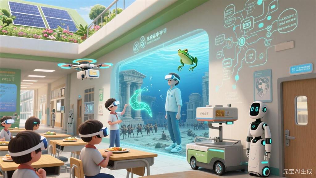 当光伏屋顶接住阳光,无人机载着知识巡航——这里是未来中学,把教室变成“任意门”:戴上VR,古希腊战场在餐盘边铺展;触击全息屏,草履虫的纤毛随指尖轻晃。