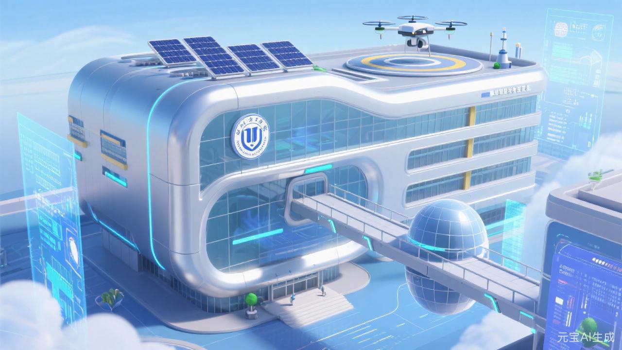 这里,银白的建筑线条流畅如科技的脉搏,太阳能板在阳光下熠熠生辉,无人机在停机坪蓄势待发,仿佛随时要开启一场智慧的探索之旅。透明的玻璃幕墙后,是无数科创的星火在闪耀;悬浮的全息屏幕上,是前沿知识的流转。