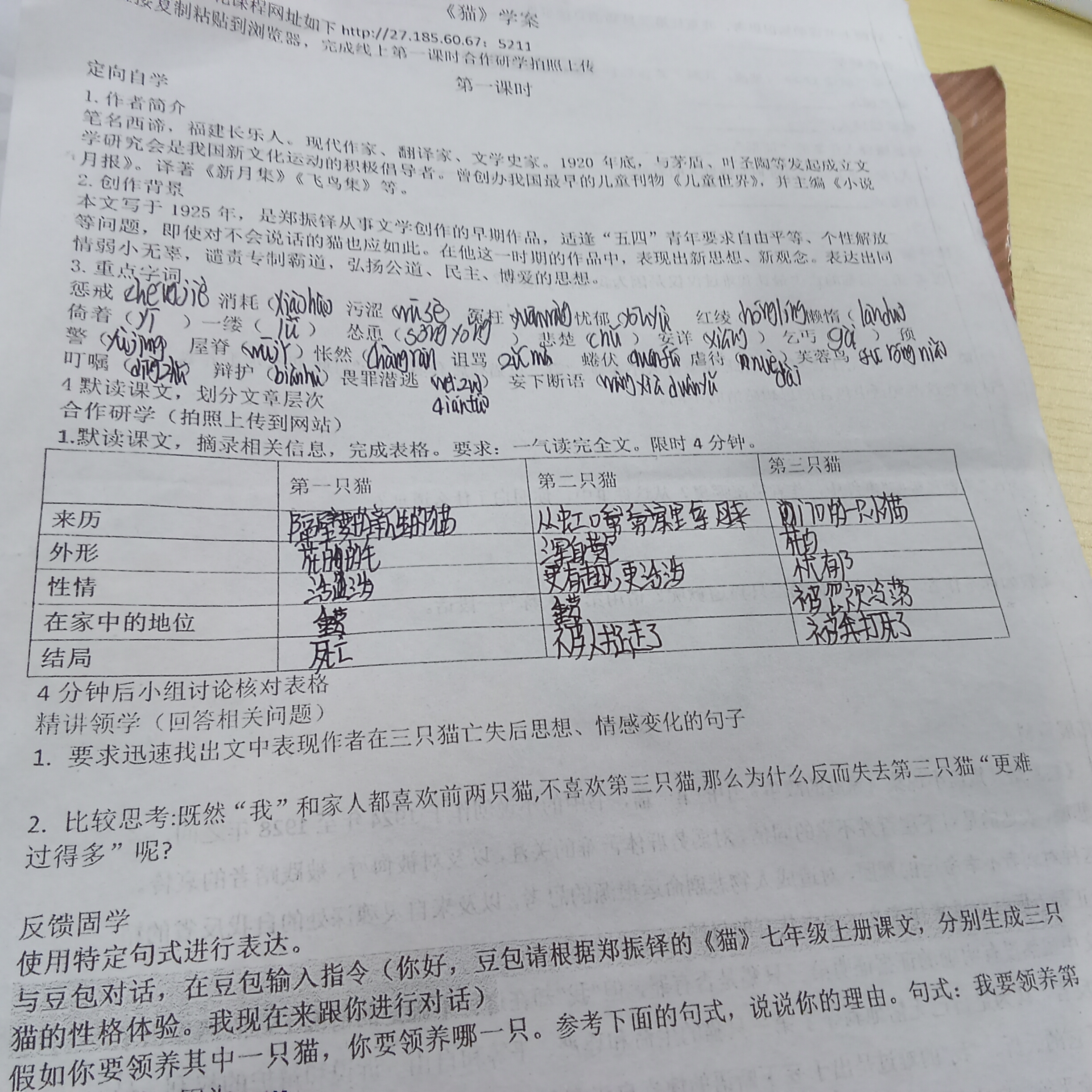 当前位置:合作研学 -> 默读课文,填写表格 -> 七年级2班