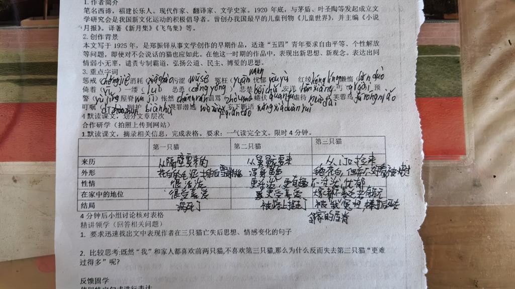 2.揣摩细节描写,了解三只猫的特点,作者及家人三次养猫的情感波澜,厘清文章的结构。