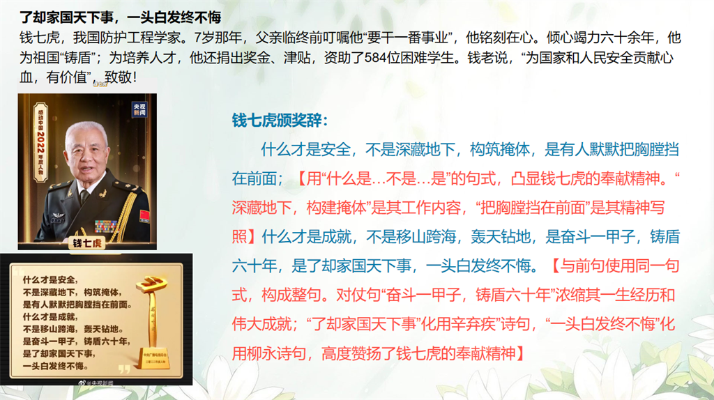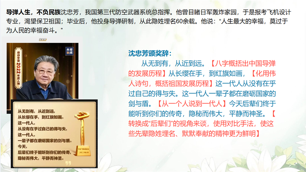 这里有优美生动的比喻,如“她把生命中所有的能量化为一缕缕的阳光,希望能照进艾滋病患者的心间,照亮他们的未来”(2003年高耀洁颁奖词);还有打动人心的对比,如“你贡献给世界的如此深奥,懂的人不多;你奉献给祖国的如此纯真,我们都明白”(2021年杨振宁颁奖辞)。